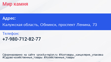 Мир камня по адресу Калужская область, Обнинск, проспект Ленина, 73 в дальнейшем Организация, размещена в следующих категориях: