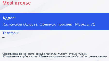 Most, ателье по адресу Калужская область, Обнинск, проспект Маркса, 71 в дальнейшем Организация, размещена в следующих категориях: