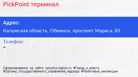 PickPoint, терминал по адресу Калужская область, Обнинск, проспект Маркса, 83 в дальнейшем Организация, размещена в следующих категориях: