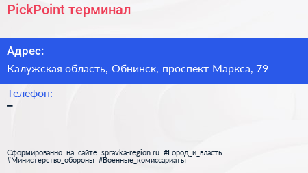 PickPoint, терминал по адресу Калужская область, Обнинск, проспект Маркса, 79 в дальнейшем Организация, размещена в следующих категориях: