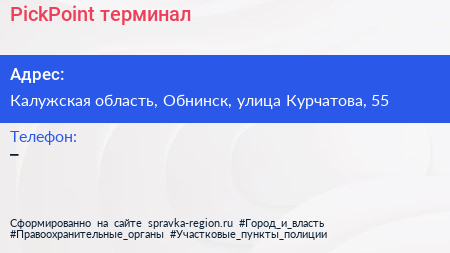 PickPoint, терминал по адресу Калужская область, Обнинск, улица Курчатова, 55 в дальнейшем Организация, размещена в следующих категориях:
