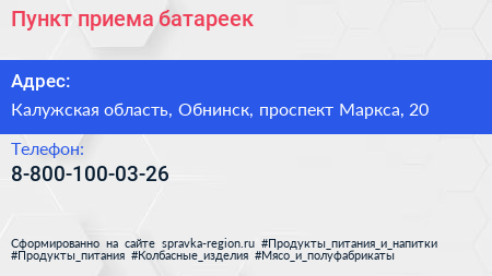 Пункт приема батареек по адресу Калужская область, Обнинск, проспект Маркса, 20 в дальнейшем Организация, размещена в следующих категориях: