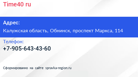 Time40.ru по адресу Калужская область, Обнинск, проспект Маркса, 114 в дальнейшем Организация, размещена в следующих категориях:
