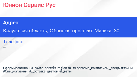Юнион Сервис Рус по адресу Калужская область, Обнинск, проспект Маркса, 30 в дальнейшем Организация, размещена в следующих категориях: