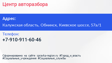 Центр авторазбора по адресу Калужская область, Обнинск, Киевское шоссе, 57а/1 в дальнейшем Организация, размещена в следующих категориях: