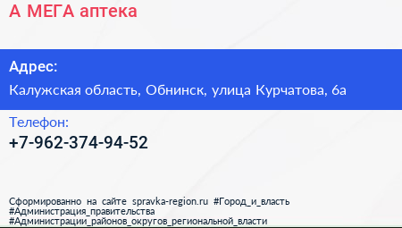 А МЕГА, аптека по адресу Калужская область, Обнинск, улица Курчатова, 6а в дальнейшем Организация, размещена в следующих категориях: