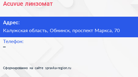 Acuvue, линзомат по адресу Калужская область, Обнинск, проспект Маркса, 70 в дальнейшем Организация, размещена в следующих категориях: