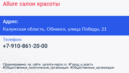 Allure, салон красоты по адресу Калужская область, Обнинск, улица Победы, 21 в дальнейшем Организация, размещена в следующих категориях:
