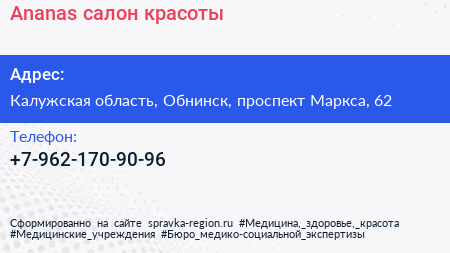 Ananas, салон красоты по адресу Калужская область, Обнинск, проспект Маркса, 62 в дальнейшем Организация, размещена в следующих категориях: