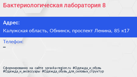 Бактериологическая лаборатория №8 по адресу Калужская область, Обнинск, проспект Ленина, 85 к17 в дальнейшем Организация, размещена в следующих категориях: