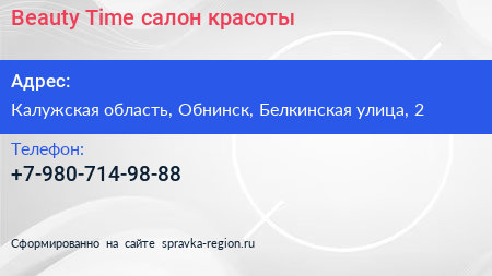 Beauty Time, салон красоты по адресу Калужская область, Обнинск, Белкинская улица, 2 в дальнейшем Организация, размещена в следующих категориях: