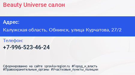 Beauty Universe, салон по адресу Калужская область, Обнинск, улица Курчатова, 27/2 в дальнейшем Организация, размещена в следующих категориях: