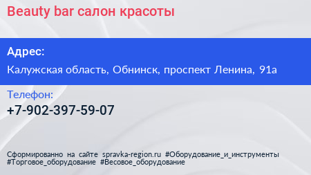 Beauty bar, салон красоты по адресу Калужская область, Обнинск, проспект Ленина, 91а в дальнейшем Организация, размещена в следующих категориях: