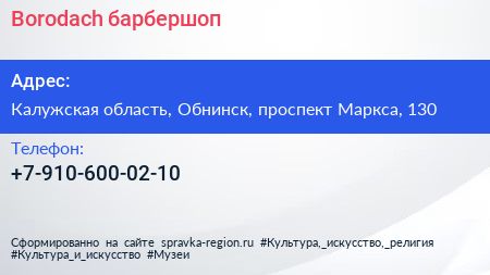 Borodach, барбершоп по адресу Калужская область, Обнинск, проспект Маркса, 130 в дальнейшем Организация, размещена в следующих категориях: