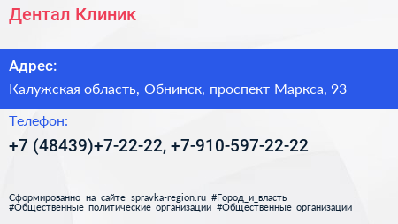 Дентал Клиник по адресу Калужская область, Обнинск, проспект Маркса, 93 в дальнейшем Организация, размещена в следующих категориях: