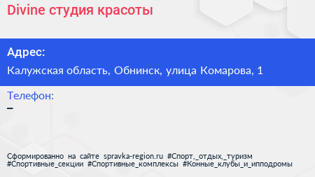 Divine, студия красоты по адресу Калужская область, Обнинск, улица Комарова, 1 в дальнейшем Организация, размещена в следующих категориях: