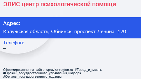 ЭЛИС, центр психологической помощи по адресу Калужская область, Обнинск, проспект Ленина, 120 в дальнейшем Организация, размещена в следующих категориях:
