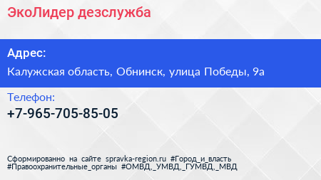 ЭкоЛидер, дезслужба по адресу Калужская область, Обнинск, улица Победы, 9а в дальнейшем Организация, размещена в следующих категориях: