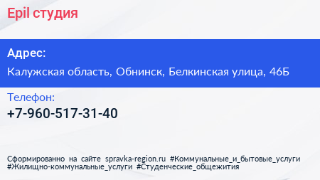 Epil, студия по адресу Калужская область, Обнинск, Белкинская улица, 46Б в дальнейшем Организация, размещена в следующих категориях: