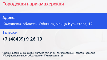 Городская парикмахерская по адресу Калужская область, Обнинск, улица Курчатова, 12 в дальнейшем Организация, размещена в следующих категориях: