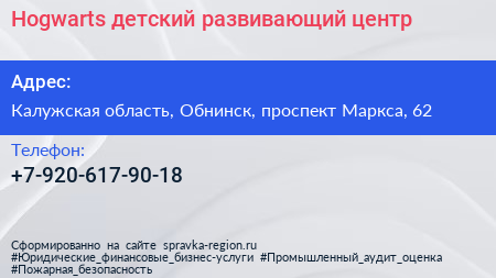 Hogwarts, детский развивающий центр по адресу Калужская область, Обнинск, проспект Маркса, 62 в дальнейшем Организация, размещена в следующих категориях: