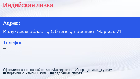 Индийская лавка по адресу Калужская область, Обнинск, проспект Маркса, 71 в дальнейшем Организация, размещена в следующих категориях: