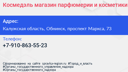 Космедэль, магазин парфюмерии и косметики по адресу Калужская область, Обнинск, проспект Маркса, 73 в дальнейшем Организация, размещена в следующих категориях: