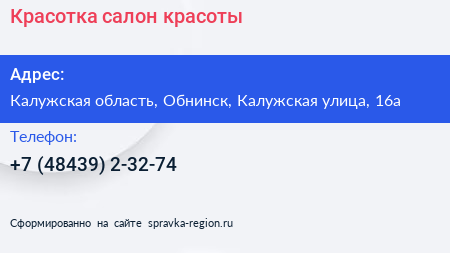 Красотка, салон красоты по адресу Калужская область, Обнинск, Калужская улица, 16а в дальнейшем Организация, размещена в следующих категориях: