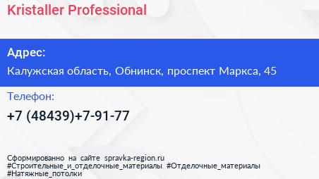 Kristaller Professional по адресу Калужская область, Обнинск, проспект Маркса, 45 в дальнейшем Организация, размещена в следующих категориях: