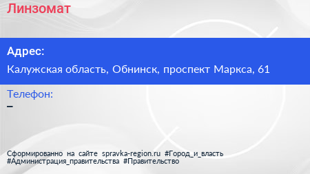 Линзомат по адресу Калужская область, Обнинск, проспект Маркса, 61 в дальнейшем Организация, размещена в следующих категориях: