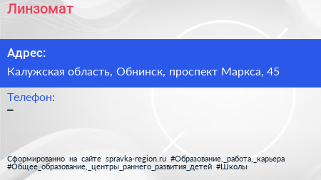 Линзомат по адресу Калужская область, Обнинск, проспект Маркса, 45 в дальнейшем Организация, размещена в следующих категориях: