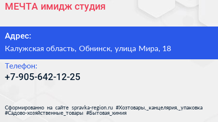 МЕЧТА, имидж-студия по адресу Калужская область, Обнинск, улица Мира, 18 в дальнейшем Организация, размещена в следующих категориях: