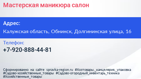 Мастерская маникюра, салон по адресу Калужская область, Обнинск, Долгининская улица, 16 в дальнейшем Организация, размещена в следующих категориях: