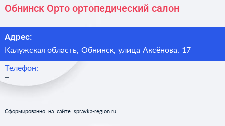 Обнинск-Орто, ортопедический салон по адресу Калужская область, Обнинск, улица Аксёнова, 17 в дальнейшем Организация, размещена в следующих категориях: