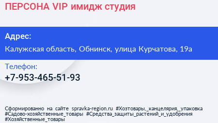 ПЕРСОНА VIP, имидж-студия по адресу Калужская область, Обнинск, улица Курчатова, 19а в дальнейшем Организация, размещена в следующих категориях: