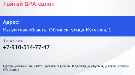 Тайтай, SPA-салон по адресу Калужская область, Обнинск, улица Кутузова, 1 в дальнейшем Организация, размещена в следующих категориях: