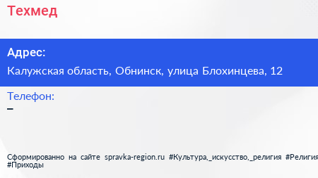 Техмед по адресу Калужская область, Обнинск, улица Блохинцева, 12 в дальнейшем Организация, размещена в следующих категориях: