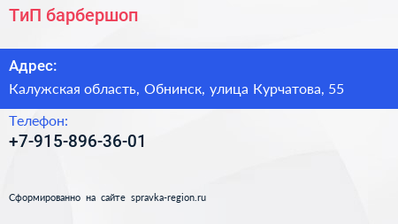ТиП, барбершоп по адресу Калужская область, Обнинск, улица Курчатова, 55 в дальнейшем Организация, размещена в следующих категориях: