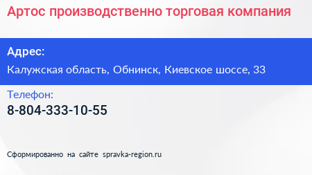 Артос, производственно-торговая компания по адресу Калужская область, Обнинск, Киевское шоссе, 33 в дальнейшем Организация, размещена в следующих категориях: