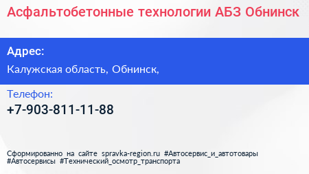 Асфальтобетонные технологии-АБЗ Обнинск по адресу Калужская область, Обнинск, в дальнейшем Организация, размещена в следующих категориях: