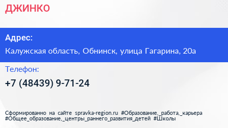 ДЖИНКО по адресу Калужская область, Обнинск, улица Гагарина, 20а в дальнейшем Организация, размещена в следующих категориях: