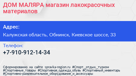 ДОМ МАЛЯРА, магазин лакокрасочных материалов по адресу Калужская область, Обнинск, Киевское шоссе, 33 в дальнейшем Организация, размещена в следующих категориях: