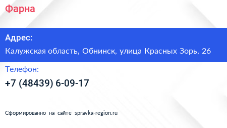 Фарна по адресу Калужская область, Обнинск, улица Красных Зорь, 26 в дальнейшем Организация, размещена в следующих категориях: