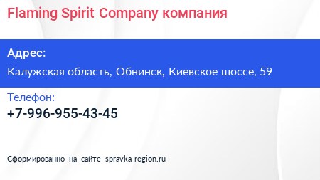 Flaming Spirit Company, компания по адресу Калужская область, Обнинск, Киевское шоссе, 59 в дальнейшем Организация, размещена в следующих категориях: