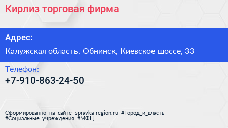 Кирлиз, торговая фирма по адресу Калужская область, Обнинск, Киевское шоссе, 33 в дальнейшем Организация, размещена в следующих категориях: