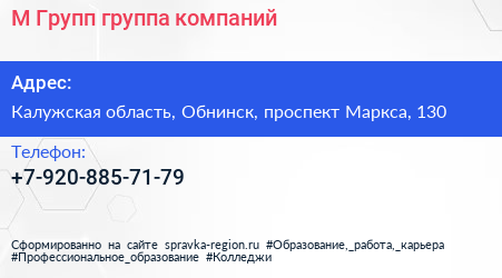 М Групп, группа компаний по адресу Калужская область, Обнинск, проспект Маркса, 130 в дальнейшем Организация, размещена в следующих категориях:
