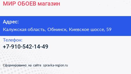 МИР ОБОЕВ, магазин по адресу Калужская область, Обнинск, Киевское шоссе, 59 в дальнейшем Организация, размещена в следующих категориях: