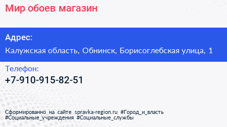 Мир обоев, магазин по адресу Калужская область, Обнинск, Борисоглебская улица, 1 в дальнейшем Организация, размещена в следующих категориях:
