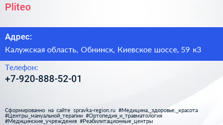 Pliteo по адресу Калужская область, Обнинск, Киевское шоссе, 59 к3 в дальнейшем Организация, размещена в следующих категориях: