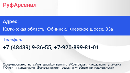РуфАрсенал по адресу Калужская область, Обнинск, Киевское шоссе, 33а в дальнейшем Организация, размещена в следующих категориях: